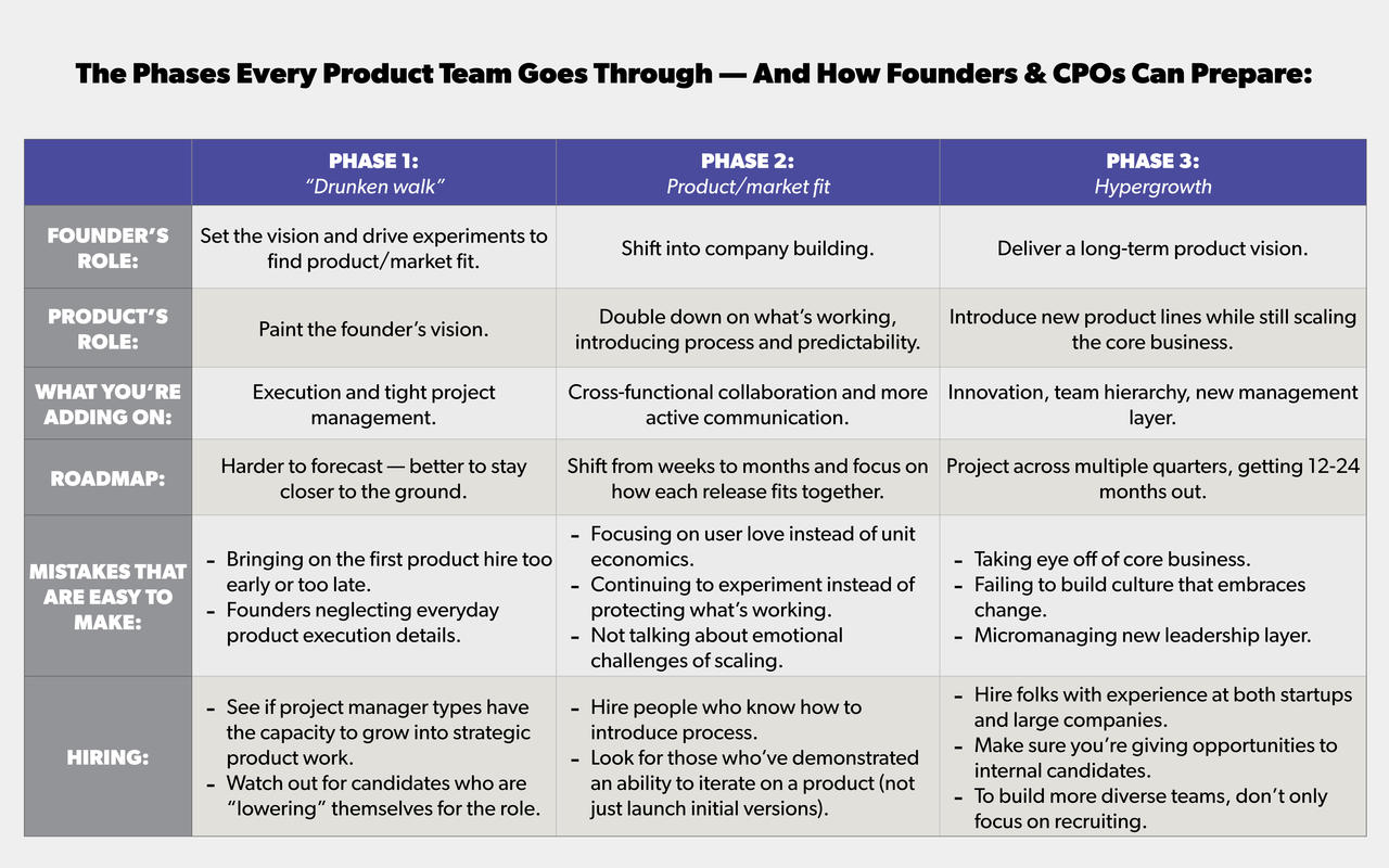 La compañía también está lista para innovar, a diferencia de la Fase 2. “El desafío consiste más en elegir las oportunidades adecuadas para perseguir y crear la cultura y los procesos para garantizar que se puedan construir cosas nuevas mientras el negocio escala, ” él dice. “Sin disciplina de producto, podría ir en 50 direcciones diferentes. Aquí es donde los líderes de productos realmente pueden ayudar a los fundadores a escalar. Los fundadores pueden decirle qué hacer de inmediato o pueden pensar en la visión de la compañía a largo plazo, pero ese punto a mitad del juego de cómo eso se traduce en varios trimestres es más difícil. Un CPO necesita poder decir: “Aquí es donde nos vemos en los próximos 12 a 24 meses”.